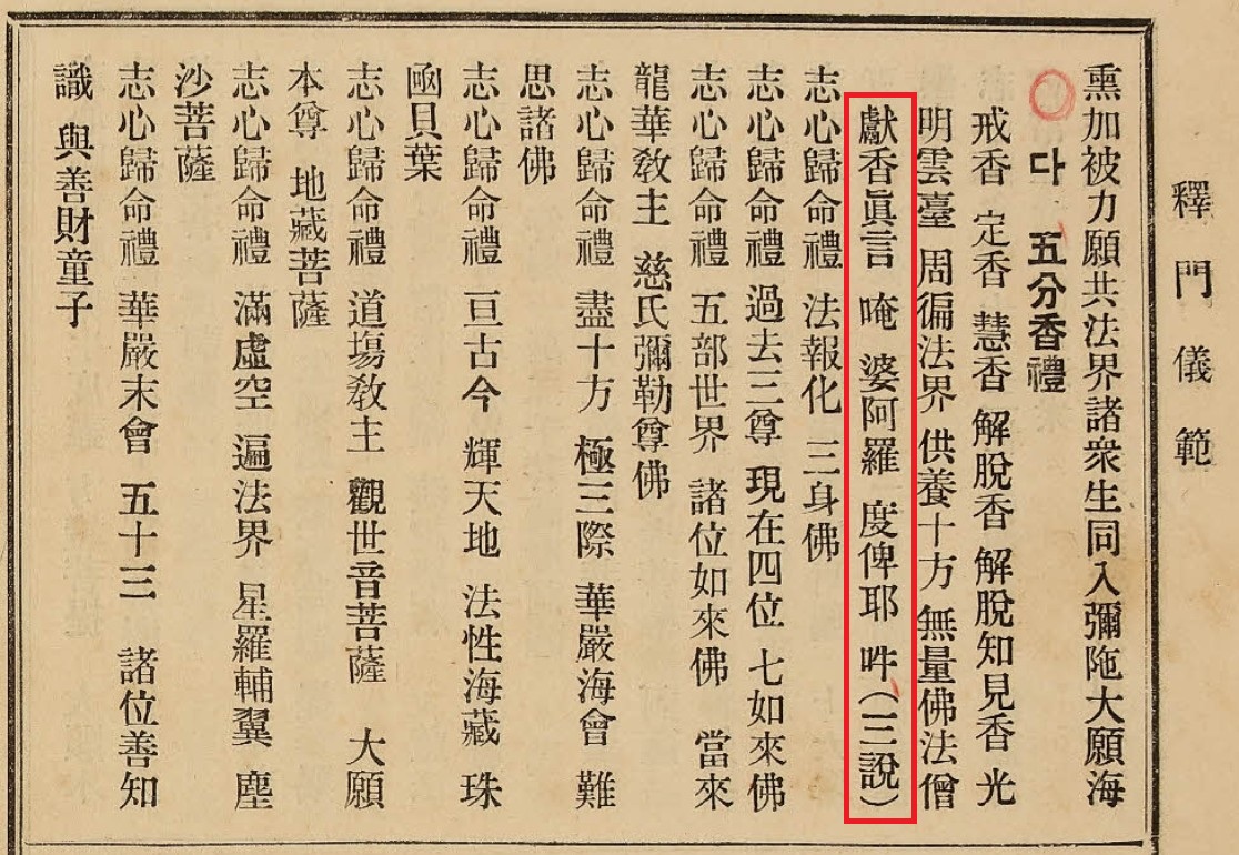 The incense offering mantra (獻香眞言, heon-hyang jin-eon) is found in the Bulja Pillam (Essential Buddhist Compendium, 佛子必覽), first published in 1931. It was intended as a collection of already existing practices, and it’s safe to assume that most of what it contains was already well established. The one novelty that the Bulja Pillam introduced was the inclusion of phonetic Hangul transcription of the Chinese text on each page. That is, while the sutra extracts, worship liturgies, mantras and dharanis were all written in Chinese characters, the pronunciation of each character was also provided in the native Korean script (Hangul).